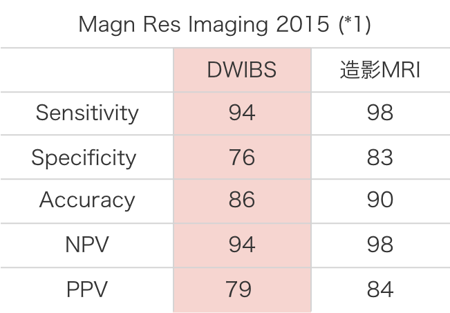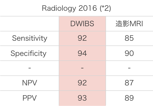 別ページでもご紹介する通り、2015〜2018年の3つの欧米の論文において、DWIBS法と造影MRIの乳癌診断能が同等であることが示されています。